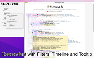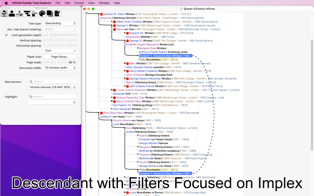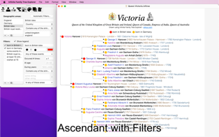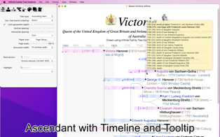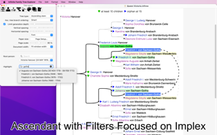 Implex support: in many families, some people marry distant relatives, leading to duplicate branches in the tree. Maybe your maternal great-grandfather was the second cousin of your paternal great-grandmother? This means that the complete branch of their common great-grandparents should appear twice in your ascending tree… but Infinite Family Tree Explorer detects this automatically, collapses the duplicate branch, and draws a dotted line pointing to the remaining branch. This dramatically simplifies the family tree of royal families, where this occurs repeatedly and recursively!